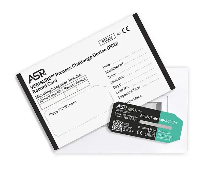 The VERISURE Migrating Integrators are used in determining whether the process condition necessary for sterilization were met inside each pack. The migrating integrators monitor time, temperature and steam and provides fast and easy to read results.